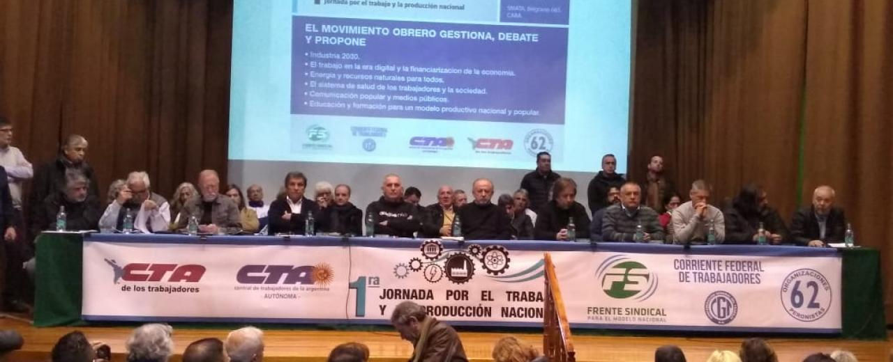 Bajo el lema "El movimieno obrero gestiona, debate y propone" se realizó la Primera Jornada por el trabajo y la producción nacional. La intención fueponer de relieve y pensar de forma conjunta, con la mirada de nuestra clase, la Industria 2030; el trabajo en era digital y la financiarización de la economía; cómo lograr energía y recursos naturales para todos; charlar sobre la salud de los trabajadores y la sociedad; el manejo de la información desde la Comunicación Popuar y medios públicos; y cómo lograr una Educación y formación para un modelo productivo nacional y popular.