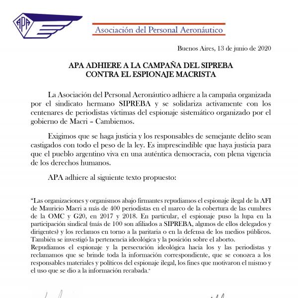 APA ADHIERE A LA CAMPAÑA DEL SIPREBA CONTRA EL ESPIONAJE MACRISTA