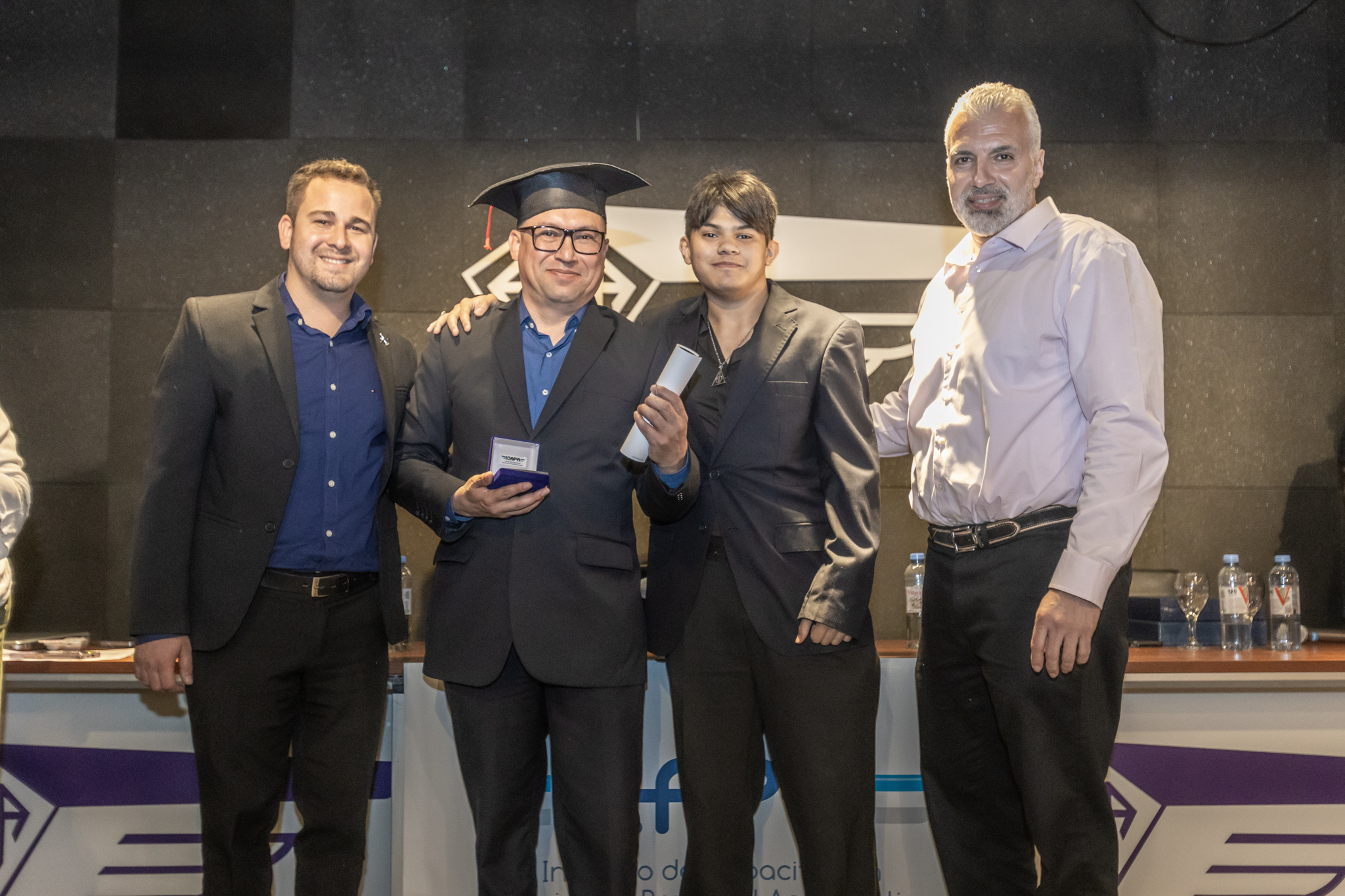 En segundo lugar, la primer promoción de graduados en nuestra modalidad de educación a distancia, con la presencia, entre otros, de alumnos de la Patagonia, que trabajan en los aeropuertos de Viedma y Neuquén, y sus familias.
