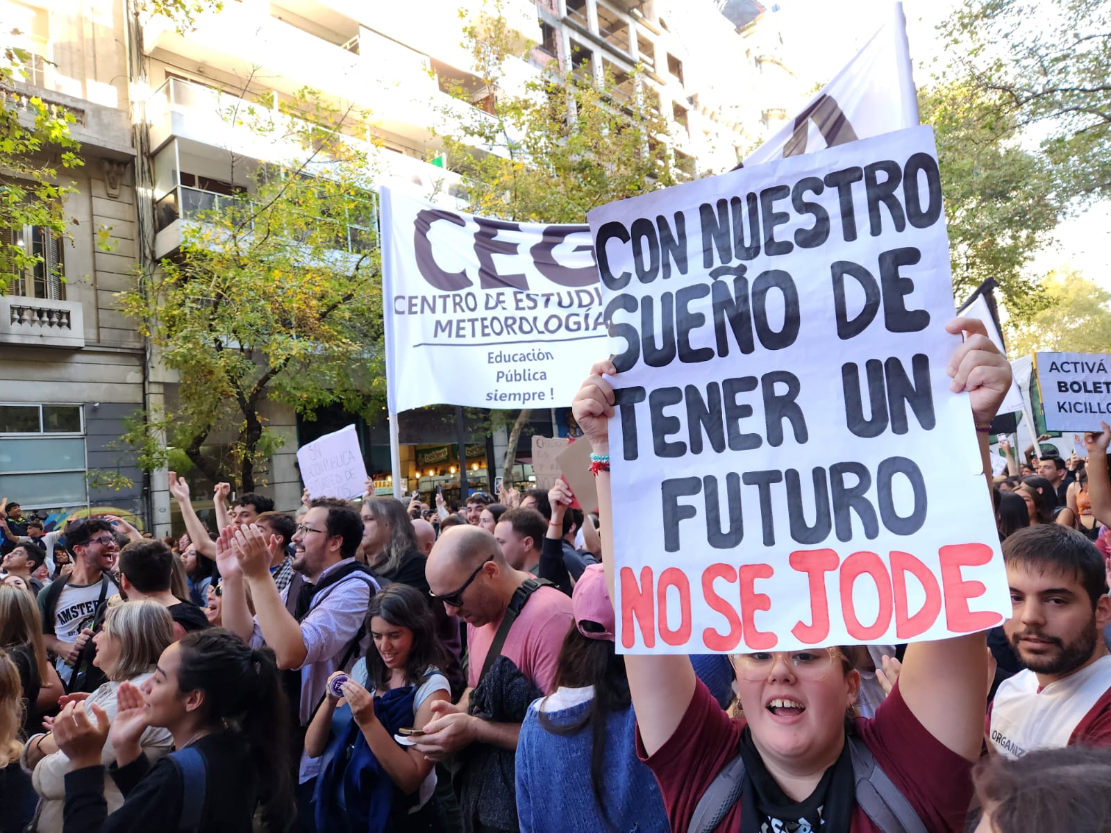 "La Universidad Pública es un derecho humano fundamental", se leía en un cartel que llevaba una señora. "La Educación no se vende" y "Milei nos quiere ignorantes", decían los de una joven. "Lxs hijxs de obrerxs queremos estudiar", se leía en otro. "Sin Universidad Pública no hay futuro", "La Universidad Pública es Patria y se defiende", planteaban otros más.