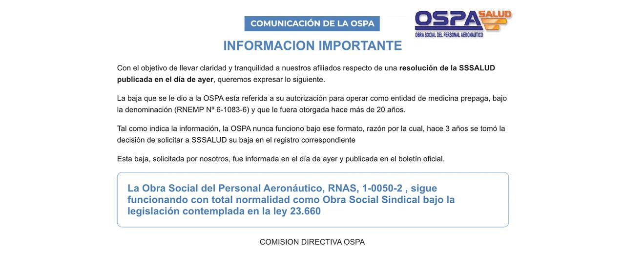 Tal como indica la información, la OSPA nunca funciono bajo ese formato, razón por la cual, hace 3 años se tomó la decisión de solicitar a SSSALUD su baja en el registro correspondiente
